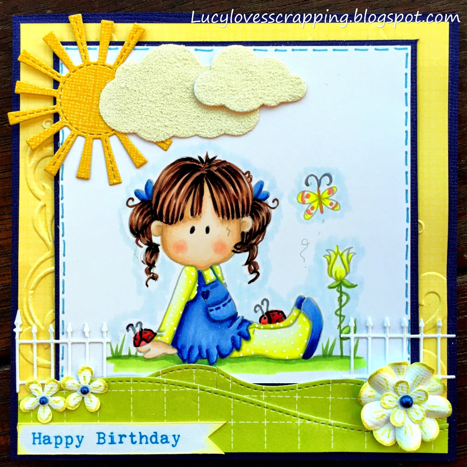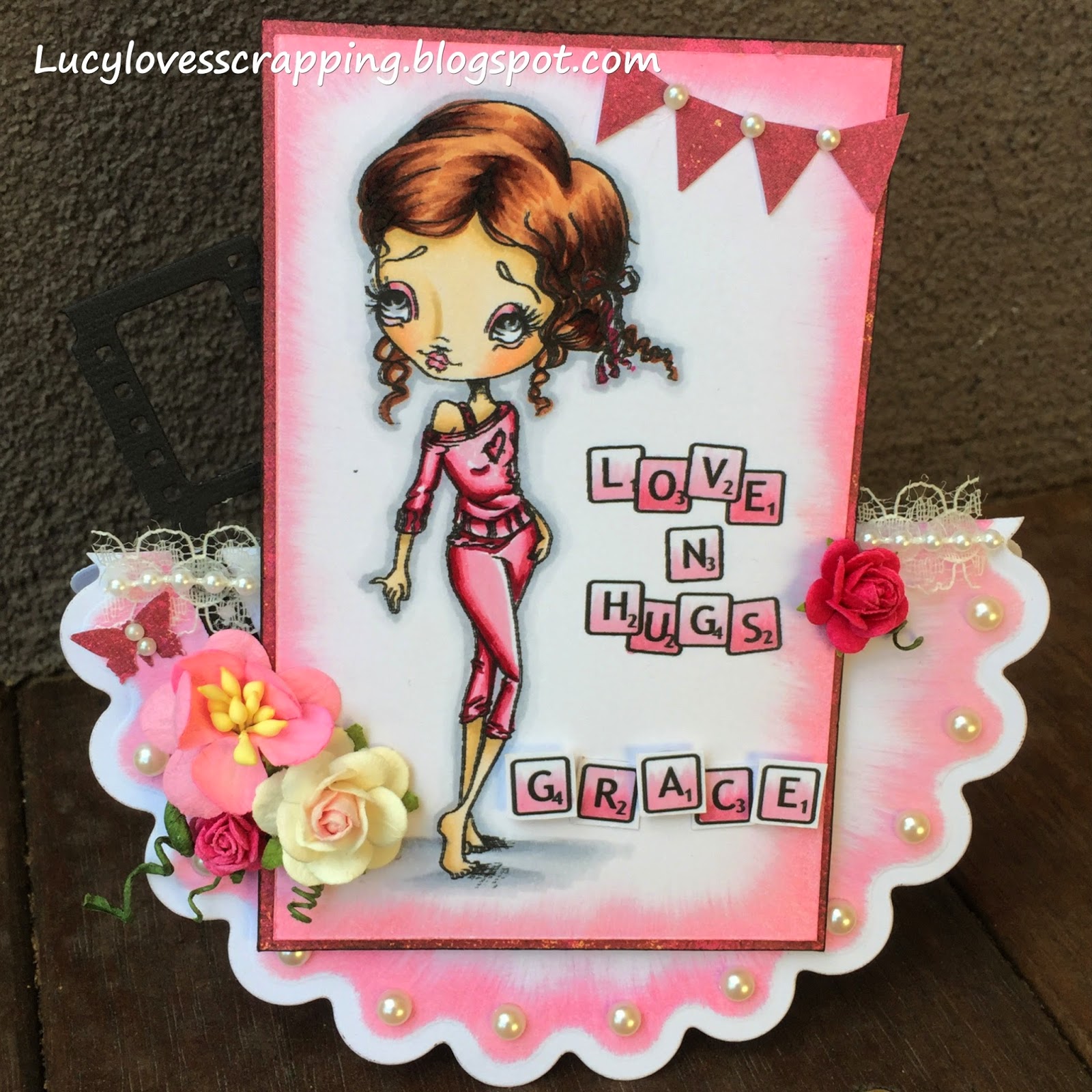 It's my last card of the day and I think it's really cute (am I allowed to say that about one of my cards hehe?) I have created this card for my niece Grace's 14th Birthday. I was lucky enough to win an Oddball Art Stamp prize through Clear it out Challenge Blog and couldn't wait to use this sassy girl. I can't seem to get an exact replica of the card so I have chosen to of the photos to show you and it's somewhere inbetween. I have also used some Scrabble Alphas from Ditzie Designs, I love them!